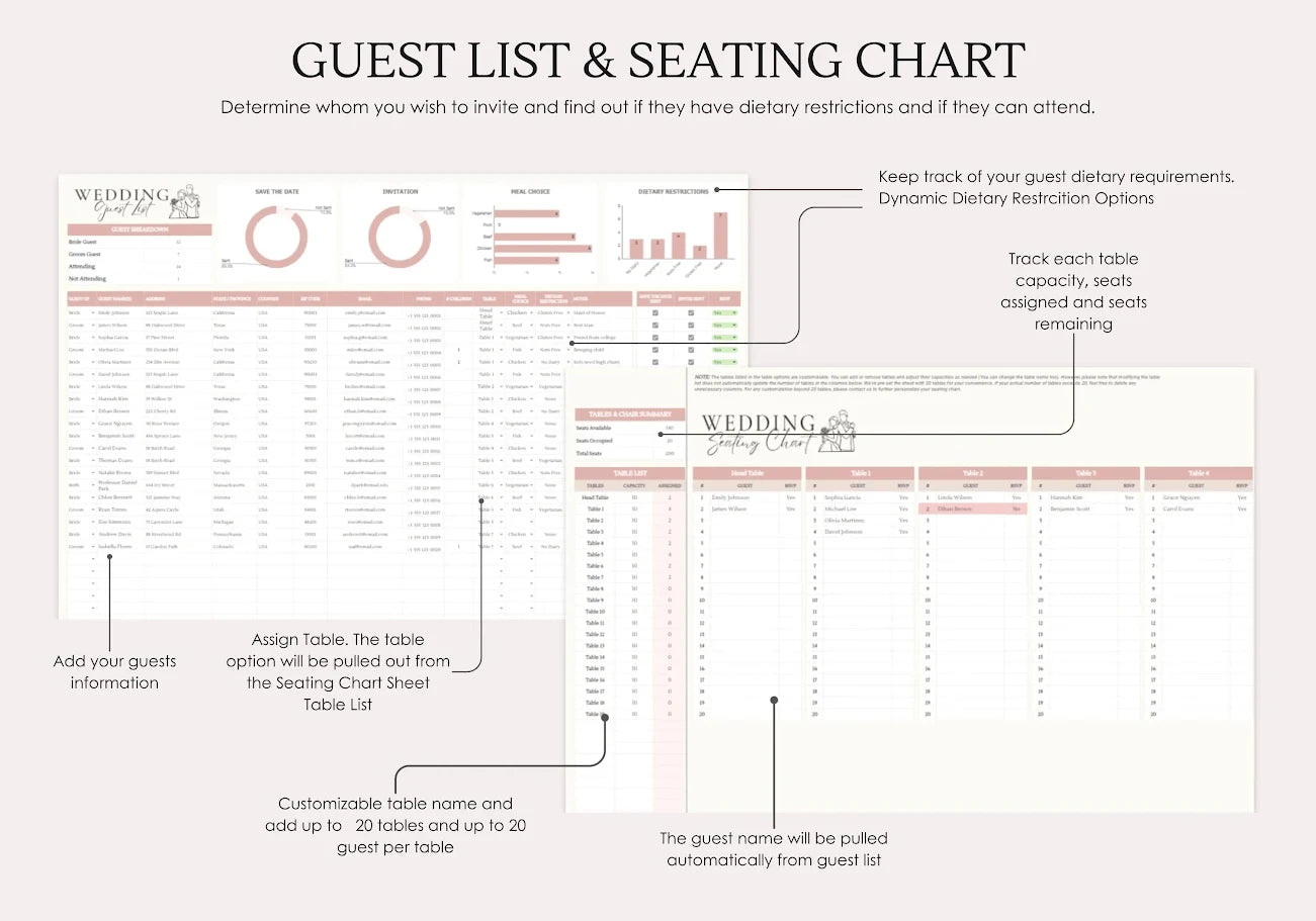 Planning for your big day doesn't need to be hectic and stressful. Simplify the process with our wedding planning spreadsheet. With it, you can track wedding expenses, make your guest list, track who is attending and their meal choices, make to-do lists with due dates, and much more!